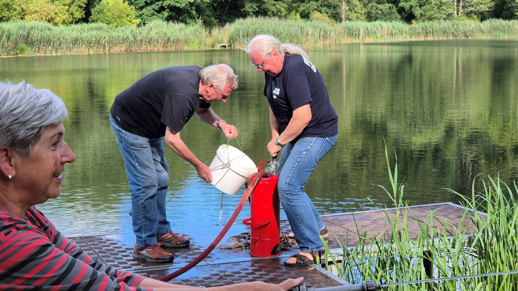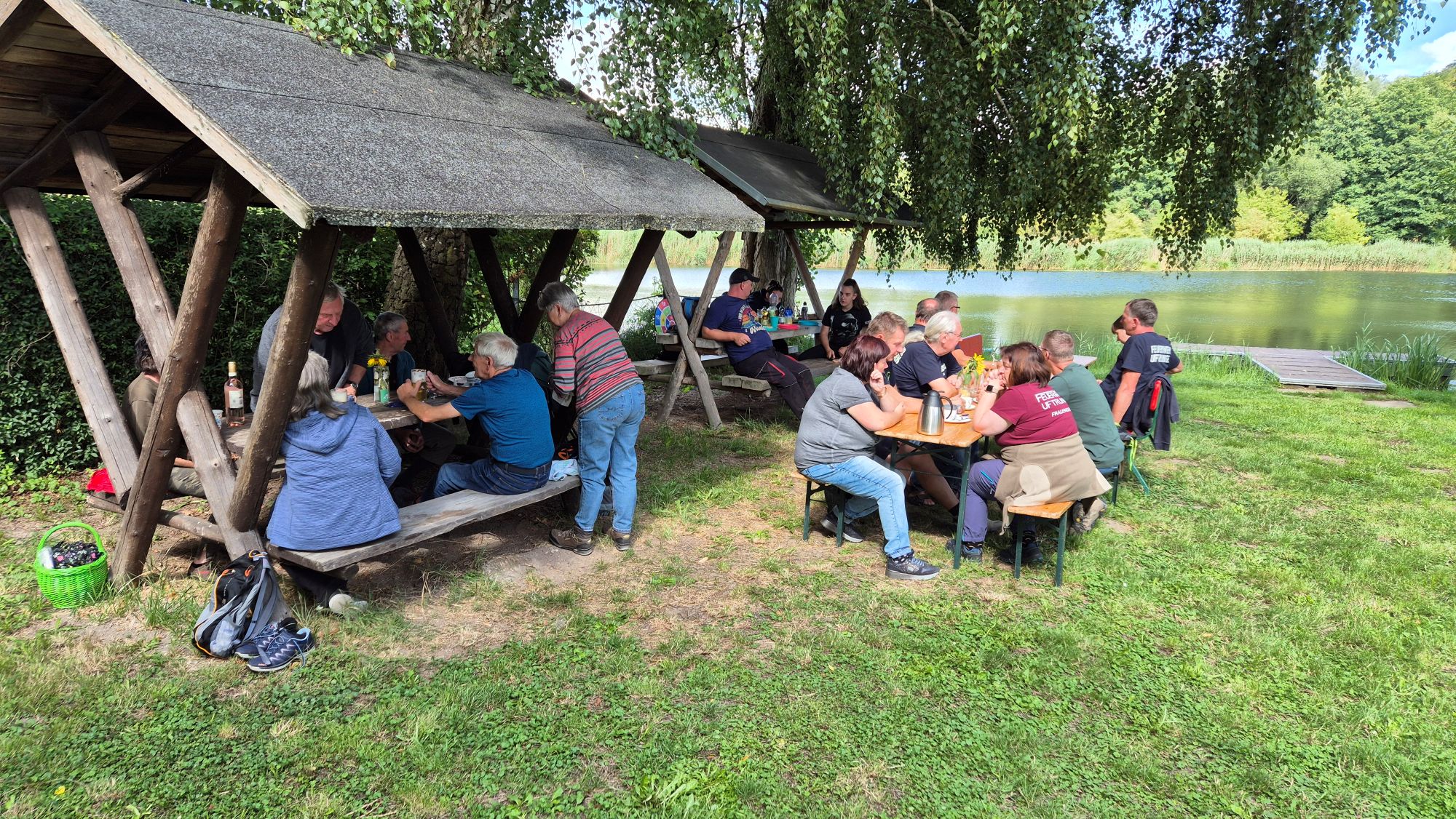 Am Ziel angekommen, erwartete uns bereits das liebevoll vorbereitete Anglerhäuschen am Uftrunger See. Das Team aus fleißigen Partnerinnen und Feuerwehrfrauen hatte Kuchen gebacken und Kaffee bereitgestellt – perfekt, um neue Energie für den dritten Teil des Tages zu tanken: unsere spannenden Gemeinschaftsspiele! Ziel war es, die „beste“ Mannschaft zu ermitteln. Disziplinen wie Gummihuhnweitwurf, Zielspritzen mit der Kübelspritze, Leinenbeutelzielwurf oder das kreative „Wortelegen“ mit einem B-Schlauch sorgten für jede Menge Spaß und Gelächter.